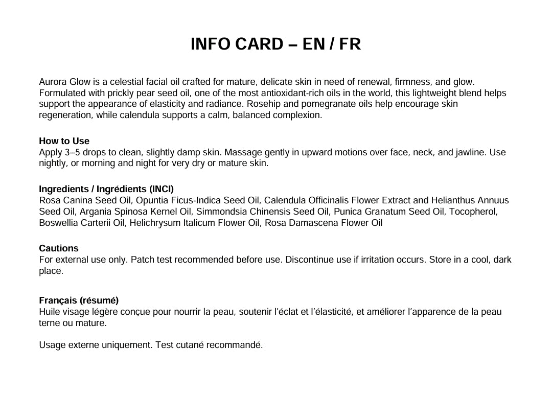 Aurora Glow is a celestial facial oil crafted for mature, delicate skin in need of renewal, firmness, and glow. Formulated with prickly pear seed oil, one of the most antioxidant-rich oils in the world, this lightweight blend helps support the appearance of elasticity and radiance. Rosehip and pomegranate oils help encourage skin regeneration, while calendula supports a calm, balanced complexion.